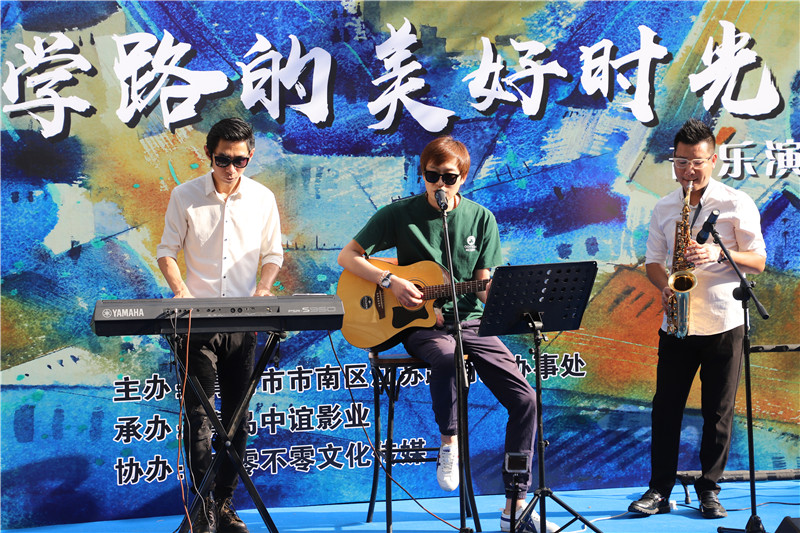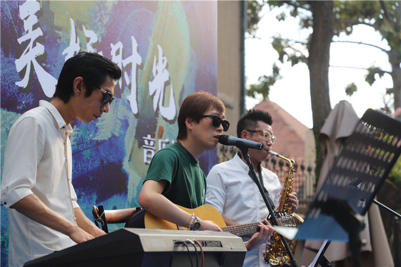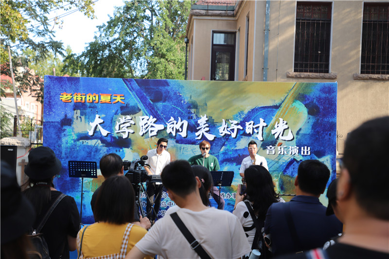 “网红街”大学路咖啡街,游人如织。8月31日下午3:30,黄县路12号青岛源艺术风貌馆门前广场(老舍故居旁),吸引了众多游客和居民驻足。由江苏路街道主办、青岛中谊影业有限公司承办、不零不零文化传媒协办的“大学路的美好时光”音乐演出在此举行。本次音乐演出由上合峰会指定歌曲《青岛故事》制作人任晓飞担任演出总监,邀请了于弋、刘津、沙建微、小光、龙龙、老街乐队等多名青岛音乐人参与。歌曲曲目以浓浓的文艺气息为基调,翻唱经典老歌、演奏经典曲目,向经典致敬,为大学路咖啡街增添了时尚音乐元素。