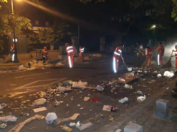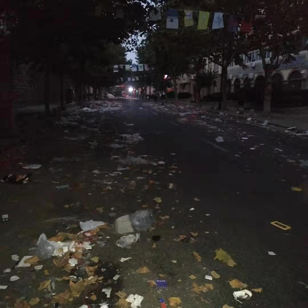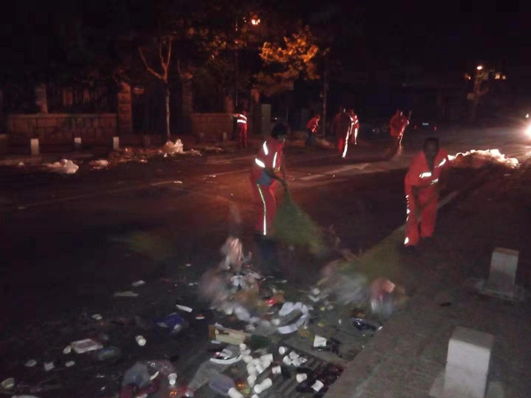 9月10日凌晨3点,主办开始将拆卸的展棚铁架陆续运走,暴露出来的路面几乎被垃圾杂物全部堆满,到处一片狼藉。市北环卫一公司出动24名一线作业人员紧跟主办方清运展架的步伐,只要空出能够打扫的路面就立即清理干净,恢复路面本色。12吨压缩车和五十铃货车紧随其后,及时清运垃圾桶和大件垃圾,最终在凌晨6点天亮前完成了全部环境卫生清理工作。市北环卫一公司一线作业人员通过连夜奋战,尽可能以最快速度还周边居民一条干净整洁的街道,同时也保障了市民们的正常出行。