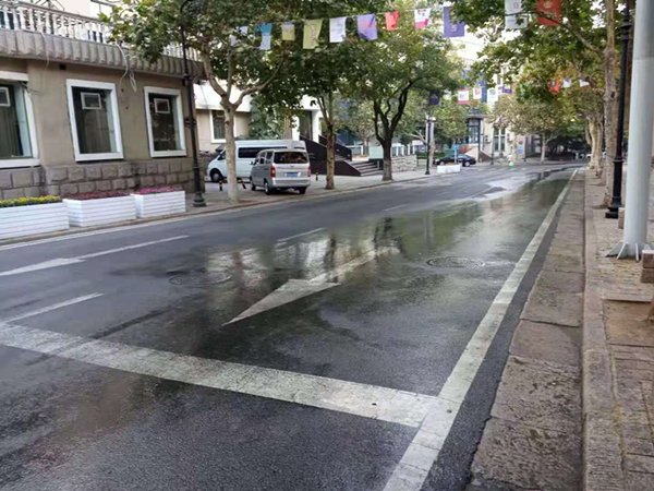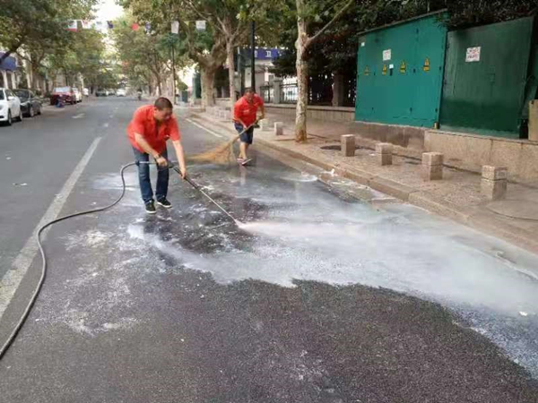 然而环卫工作并没有完全结束,馆陶路路面上还残留了十余处由商户们留下的油污、奶粉、沙土等污迹。作业经理带领4名管理员使用1.5吨高压水车对污染路面进行清刷,最终在早上7点彻底解决了污渍,还路面以本色。