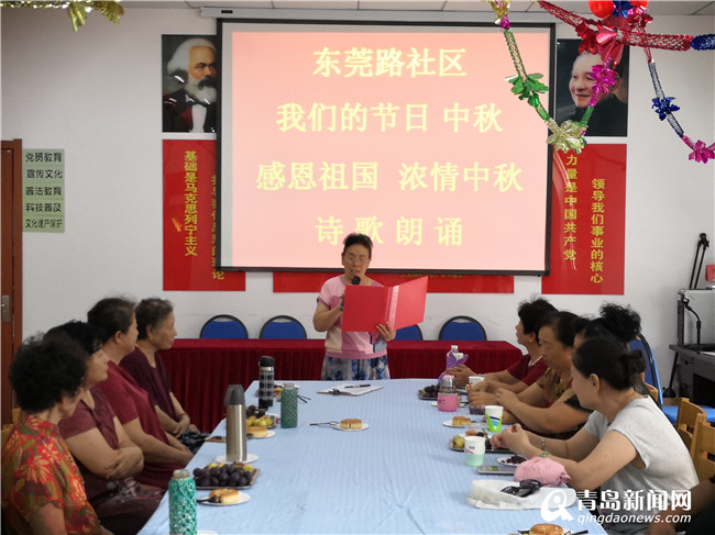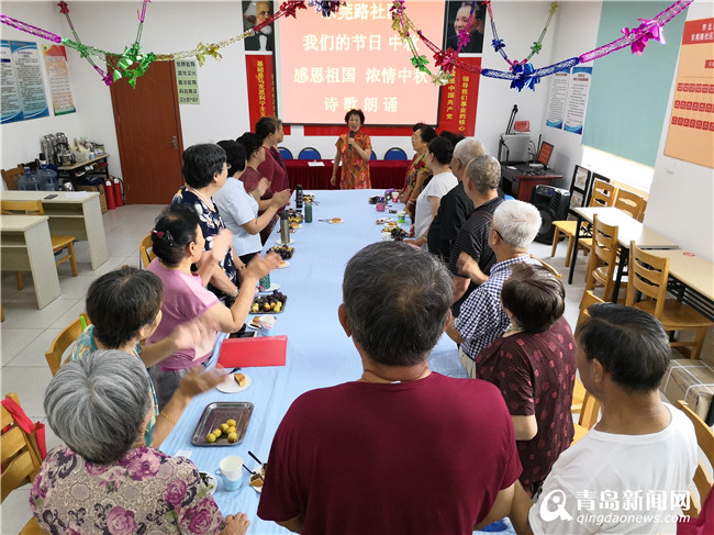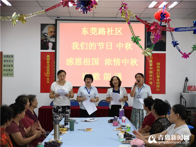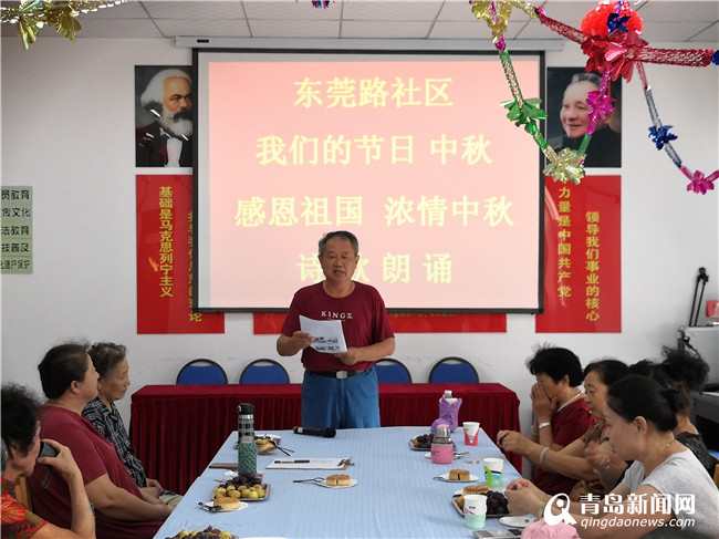 青岛新闻网 9月11日讯 “八月的桂子,吴刚的美酒,千里共婵娟的中秋。举杯,还有祝福……”9月10日下午,东莞路社区会议室里一片热闹。一年一度的传统节日中秋佳节即将到来,又恰逢新中国成立70周年,辽源路街道东莞路社区党委“双节同庆”,举办“感恩祖国,浓情中秋”诗歌朗诵活动,居民们朗诵诗歌,表达对祖国的祝福。