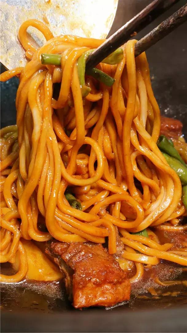 焖面,主要技术在一个焖字上,焖面不是煮面,要靠少量的汤,蒸发的水气来把面焖熟。氤氲着豆角、土豆、新葱、和五花肉香气的汤汁,从锅盖缝隙里飘出丝丝气息。临出锅时撒上蒜末提味,那铺满整间店铺的浓香总能把食客的哈喇子给引下来。