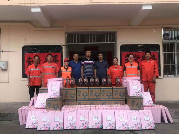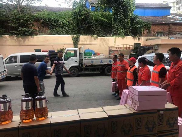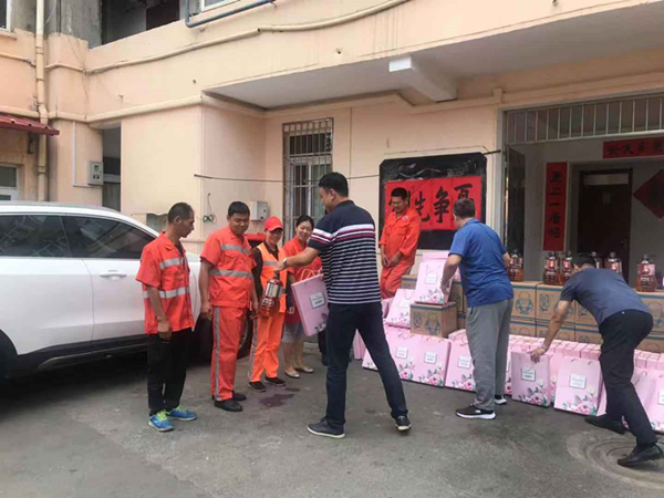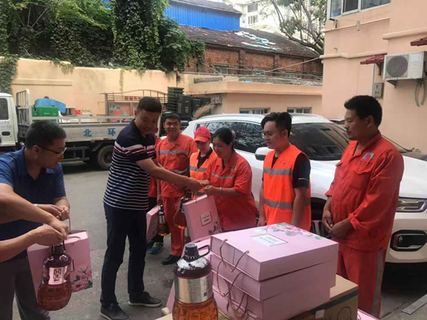 办事处领导们为环卫工人送上节日的祝福和问候,带来了花生油、月饼等节日礼物,同时说道:“环卫工人是我们城市的美容师,工作十分辛苦,长年累月风里来雨里去,为城市的环境整洁做出了贡献,向一直坚守在一线的环卫工人表示衷心感谢。”市北环卫一公司镇江路公司全体职工十分感谢镇江路街道办事处领导一直以来对环卫工作的的理解和支持,并表示一定会脚踏实地地做好本职工作,坚守岗位,再接再厉,为改善辖区环境,建设国际航运贸易金融创新中心核心区,共建“美丽青岛”贡献自己的力量。