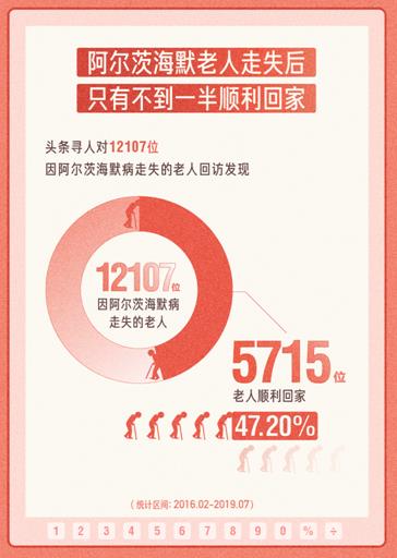 头条寻人对2016年2月至2019年7月累计发布的30052名走失老人的求助信息进行分析后,得出了一些阿尔茨海默病与走失相关的结论。例如:阿尔茨海默病是老人走失主因;阿尔茨海默老人走失后,只有不到一半顺利回家;24小时是找回阿尔茨海默老人的黄金时间。