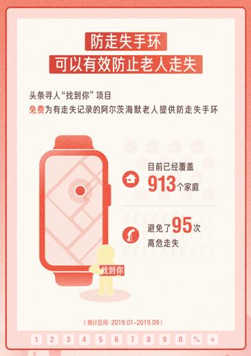 头条寻人是今日头条于2016年2月启动的公益寻人项目,致力于帮助各类走失者回家。为了提升易走失老人(特别是阿尔茨海默老人)的防走失意识、避免多次走失,2019年1月,头条寻人启动了子项目“找到你”,为有多次走失记录的老人(特别是阿尔茨海默老人)免费提供防走失手环。截至目前,已经覆盖了913个家庭,避免了95次高危走失。未来将继续为符合条件的老人提供“爱牵挂”防走失智能手环。