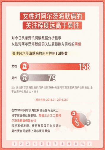 据媒体报道,我国65岁及以上人群中失智症患病率为5.6%,即有930万患者,其中阿尔茨海默病约600万。但人们对阿尔茨海默病的关注还远远不够。2018年1月至2019年6月今日头条资讯阅读数据显示,人们对老年慢性病的关注度由高向低依次是:高血压、糖尿病、冠心病,阿尔茨海默病以21.9亿次阅读位列第四。此外,据统计,在今日头条平台上,女性比男性更加关注阿尔茨海默病。