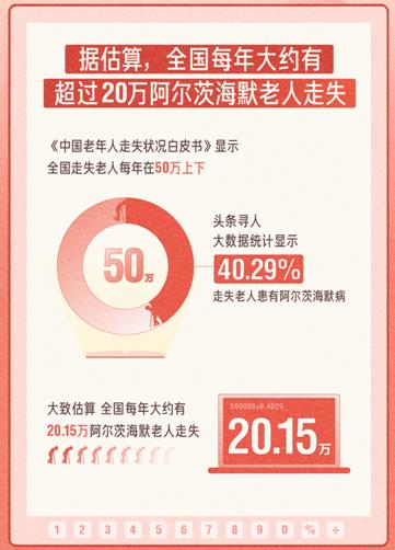中民社会救助研究院发布的《中国老年人走失状况白皮书》统计显示,全国走失老人每年在50万上下。而头条寻人对三年半间向其求助的寻人数据统计发现,40.29%走失老人患有阿尔茨海默病。进而大致估算出目前全国每年走失的阿尔茨海默老人的规模在20.15万左右。