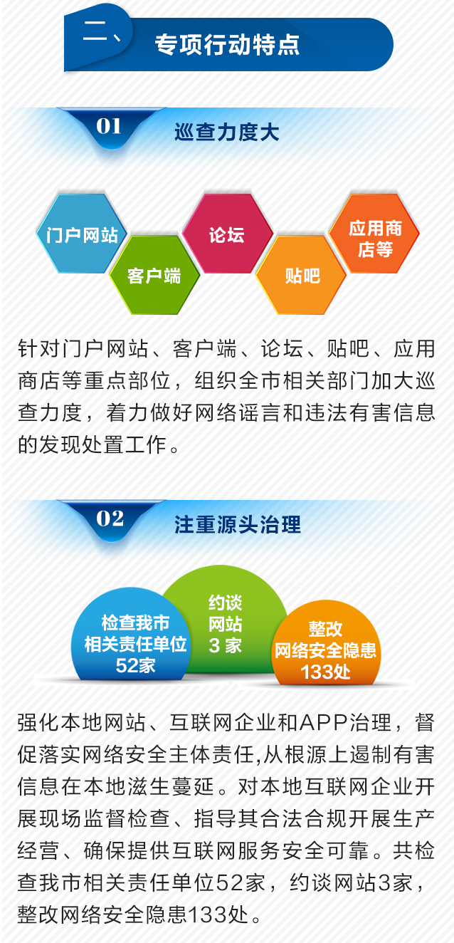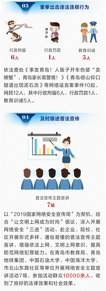 今年以来,青岛市委网信办、市公安局、市通信管理局联合开展“雷霆净网”整治行动。此次专项行动重点打击谣言和虚假信息,整治低俗庸俗信息,治理违规采编、“标题党”等破坏网上新闻传播秩序的行为,整治使用虚假备案信息、标示备案信息与实际情况不符的网站以及各类钓鱼网站等。