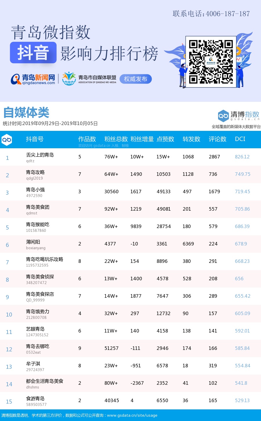 青岛新闻网10月15日讯(记者 邢书玲)由青岛新闻网、清博指数平台联手打造的“青岛微指数抖音影响力排行榜”今日发布一周(9月29日-10月5日)榜单。