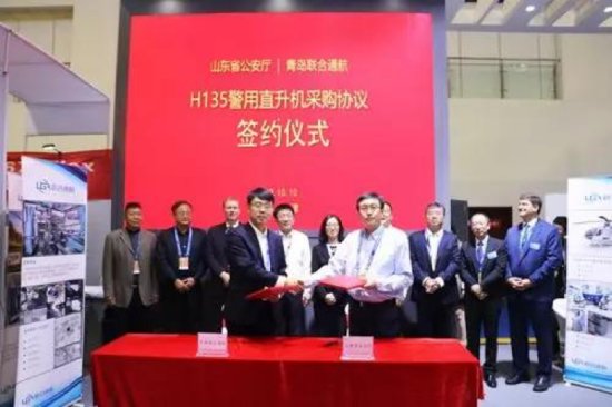 10日上午,青岛联合通航与山东省公安厅在直博会现场签署了空客H135警用直升机1架采购合同和2架采购协议。