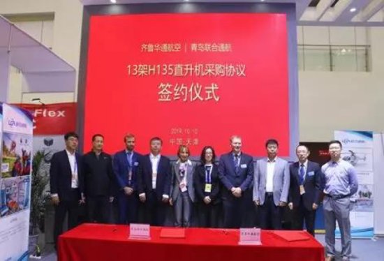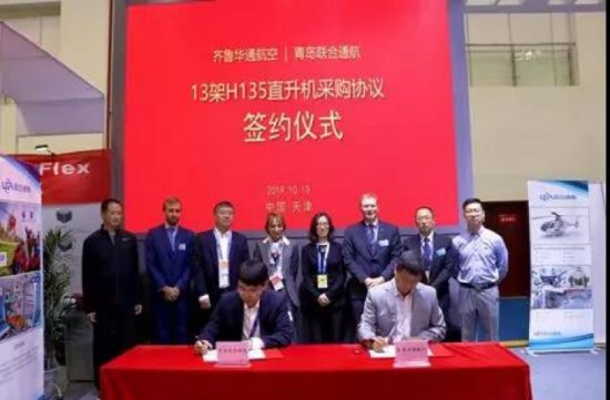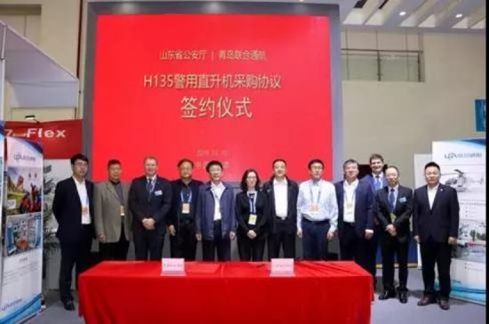 10日上午,青岛联合通航与山东齐鲁华通航空有限公司(简称“齐鲁航空”)在直博会现场签署了《关于13架空客H135直升机的采购协议》。