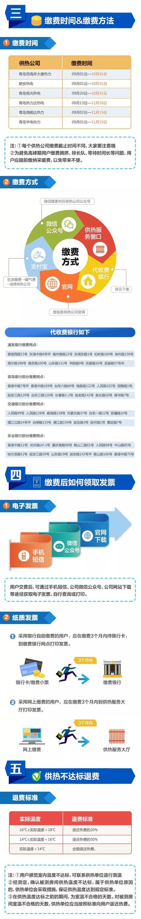 缴费方式:除了微信、支付宝、供热公司微信公众号、供热公司官网可以缴纳之外,在青岛还可以去以下银行代缴:浦发银行、青岛银行、交通银行、农业银行(代收银行网点如图)