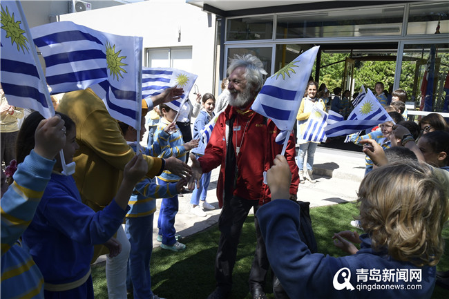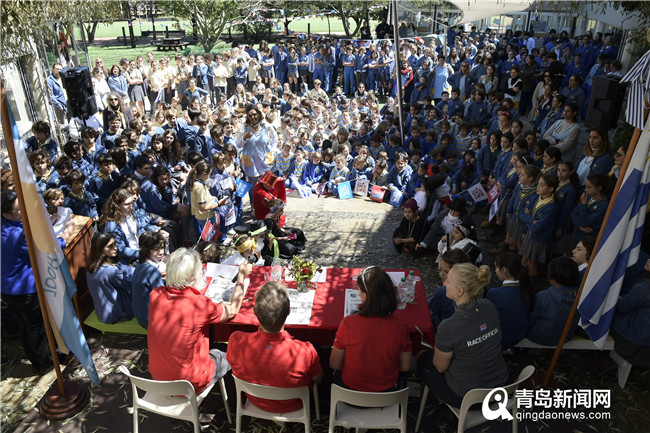 青岛新闻网 10月22日讯 乌拉圭埃斯特角城当地时间十月二十一日,来自青岛号的三名国际船员来到当地的一家学校,与孩子们进行了欢快的交流和互动。船员代表们还不知道这些学生们为了他们的到来早已准备就绪,给他们准备了盛大的“贵宾”礼遇。来自青岛号的Keith Baker,Joanne Nuwar和Bertrand Hould在450多名中小学生的簇拥欢呼下来到了活动现场。船员代表还与学校老师进行了见面,这些老师在过去几个月的时间中一直给学生们开展克利伯帆船赛的主题教学活动,让孩子们对这项赛事充满了好奇和期待。