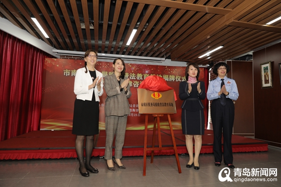随后,青岛市司法局党委委员、副局长刘春颖,青岛市税务局党委委员、副局长何倩,杨红局长,胡明主席共同为税收普法教育基地揭牌。