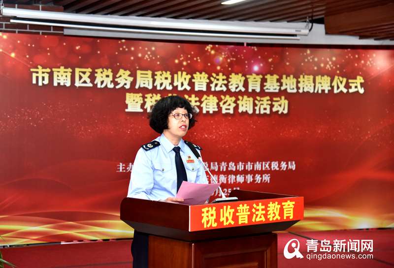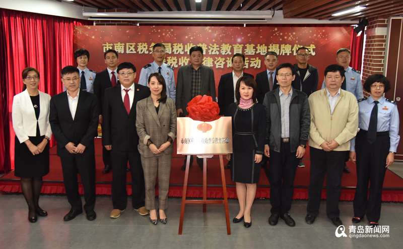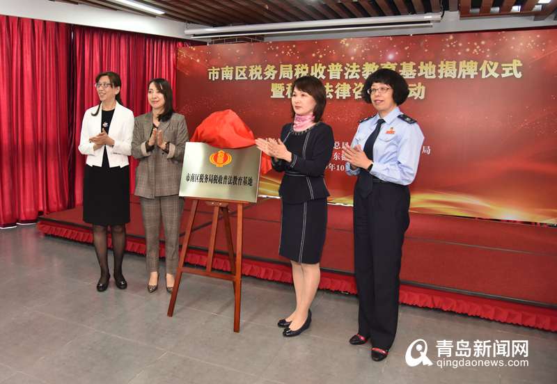 随后,青岛市司法局党委委员、副局长刘春颖,青岛市税务局党委委员、副局长何倩,杨红书记,胡明书记共同为税收普法教育基地揭牌。