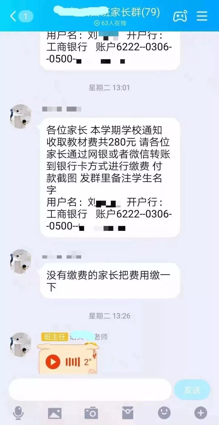 这个时候,有一名家长心里有了疑问因为他发现“班主任”竟然有两个QQ便客气地质问了一声毕竟班主任对自己的孩子至关重要千万不能得罪这个“班主任”马上回复道“都是他的QQ号”他这么一说,所有家长都消除了疑问全部按要求转了账50多名家长就是15000多元