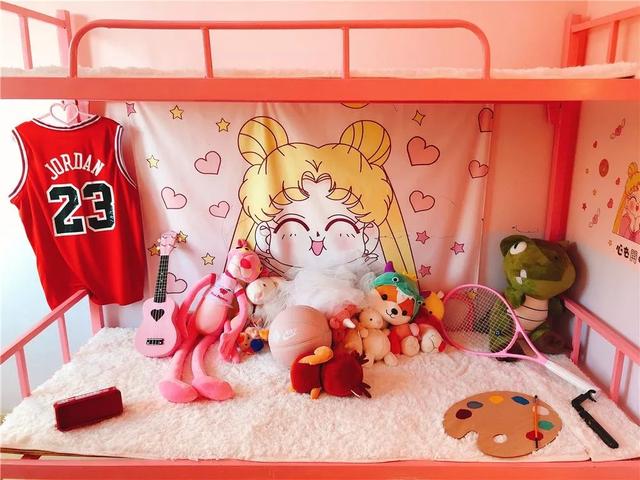 熟悉的宿舍上下铺,你有多久没睡过啦?床上堆满了粉红顽皮豹、尤克里里、球拍等各种小道具,可爱风、文艺风、运动风任你随意切换~