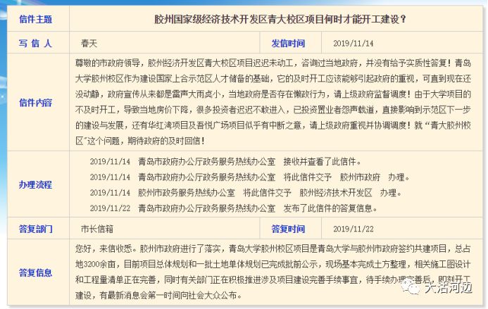 看图中,原来的中骏地块已经被抹去,全部划进了胶州校区的建设范围。校区内中骏置业地块相关事宜,目前相关部门正在积极推进中。看似已经得到解决。可就在所有人都以为青大校区马上开工的时候,施工现场却纹丝不动。青岛大学新校区尚未开工建设,究竟卡在了哪里?根据官方11月22日最新回复内容:青岛大学胶州校区项目是青岛大学与胶州市政府签约共建项目,总占地3200余亩,目前项目总体规划和一批土地单体规划已完成批前公示,现场基本完成土方整理,相关施工图设计和工程量清单正在完善,同时有关部门正在积极推进涉及项目建设完善手续事宜,待手续办理完善后,即刻开工建设。