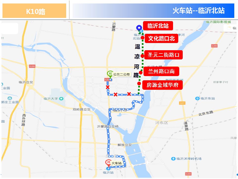 K10路原由火车站运行至公交二公司,调整后由火车站运行至临沂北站,取消原成都路(温凉河路-沂蒙路)、沂蒙路(成都路-南昌路)段的运营,调整至温凉河路、雄安路、汤河路运营。调整后线路主要途经陶然路、中丘路、金雀山路、沂蒙路、上海路、汤河路、兰亭路、黄白河路、成都路、温凉河路、雄安路、汤河路。优化调整后主要解决兰山老城区、北城东部片区居民的乘公交至高铁出行需求。