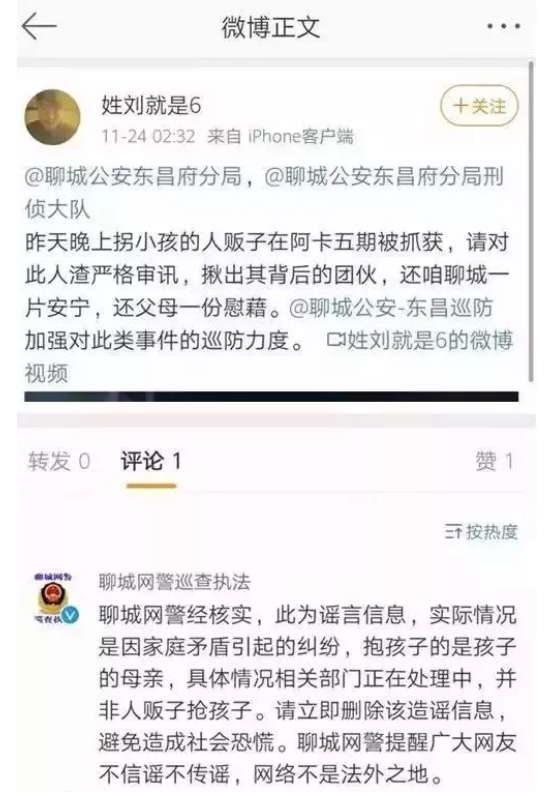 针对网友反映的问题,聊城网警回应表示,经调查核实,此为谣言信息,实际情况是因家庭矛盾引起的纠纷,抱孩子的是孩子的母亲,具体情况相关部门正在处理中,并非人贩子抢孩子。