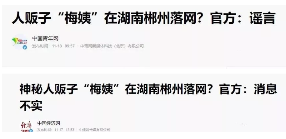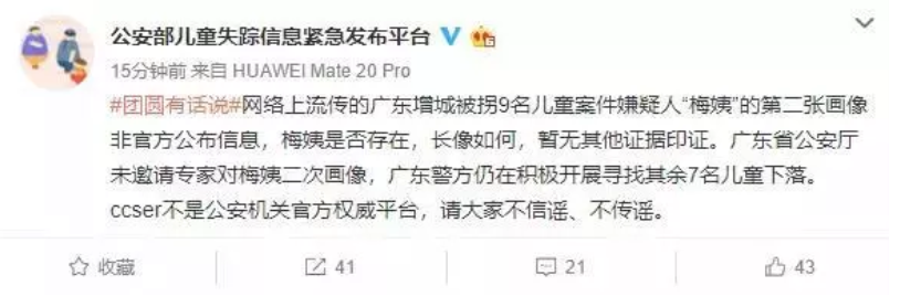 11月17日,人贩子“梅姨”画像被“官方”爆出,几天之间朋友圈、微博热搜各大V纷纷转发。不久之后,公安部儿童失踪信息紧急发布平台官方微博发布辟谣消息: