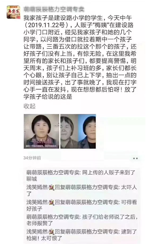 随后,人贩子“梅姨”来聊城的信息在更多聊城市民微信群、朋友圈传播。