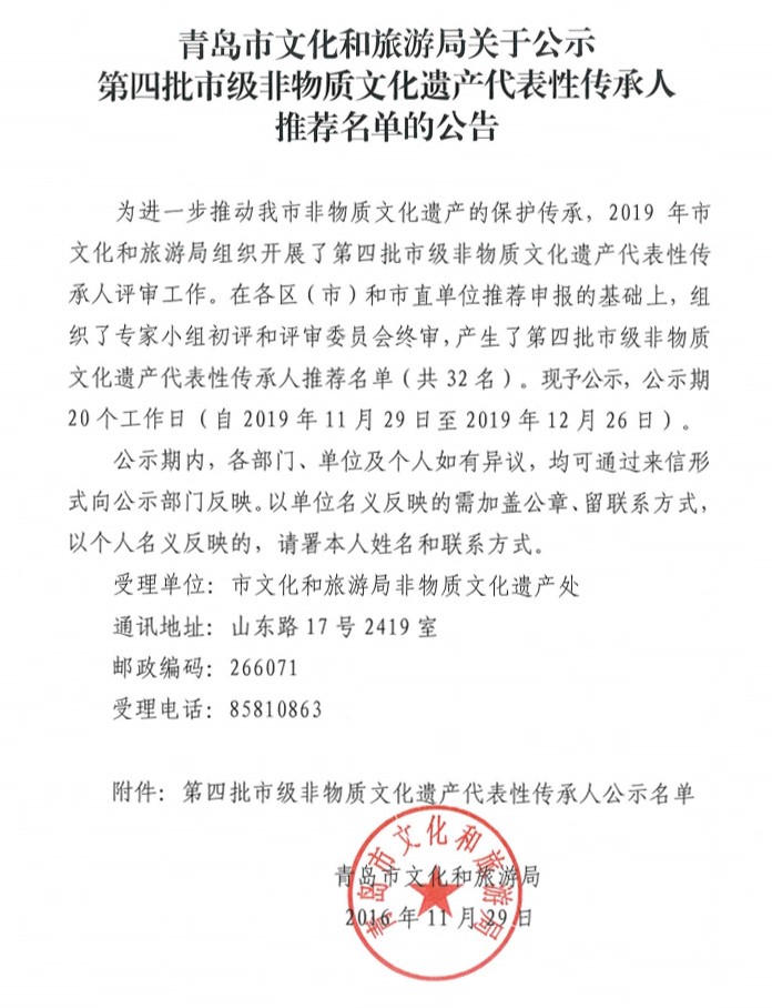 为进一步推动我市非物质文化遗产的保护传承,2019年市文化和旅游局组织开展了第四批市级非物质文化遗产代表性传承人评审工作。在各区(市)和市直单位推荐申报的基础上,组织了专家小组初评和评审委员会终审,产生了第四批市级非物质文化遗产代表性传承人推荐名单(共32名)。现予公示,公示期20个工作日(自2019年11月29日至2019年12月26日)。