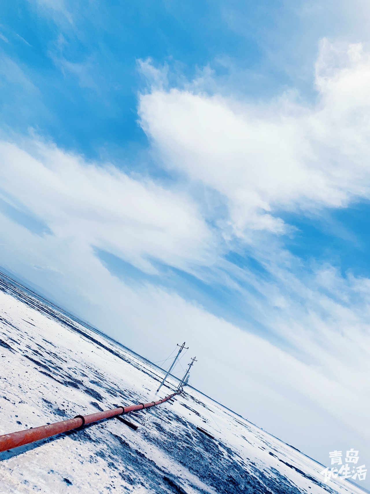 空旷的湖面,废旧的电线杆,