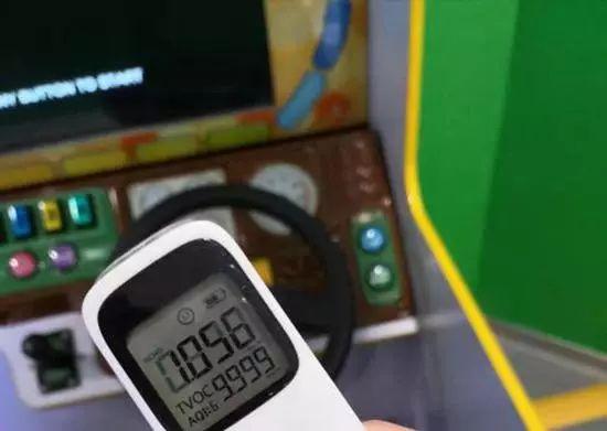 随后,记者来到商场四楼中庭。此区域较为开阔,相较于密闭的空间空气流动性好。在此处测得甲醛数值为0.783mg/m³, TVOC(总挥发有机物)值为6.095 mg/m³。在四楼孩童娱乐区域,手持设备测得的甲醛数值为1.056 mg/m³, TVOC(总挥发有机物)为9.999mg/m³。均超过国家规定值数倍以上。