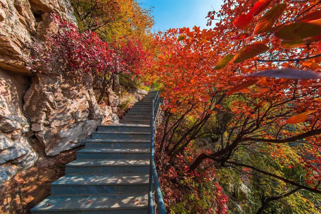 到了初冬,盘山路上落满秋叶,踏过去沙沙作响,北风轻轻掠过,悬崖上的红叶满树招摇,漫步山间便听到阵阵冬日呢喃,若是到了深冬,晨起一层大雾将山顶变成一段白色的童话,雾凇美景更是羡煞旁人!