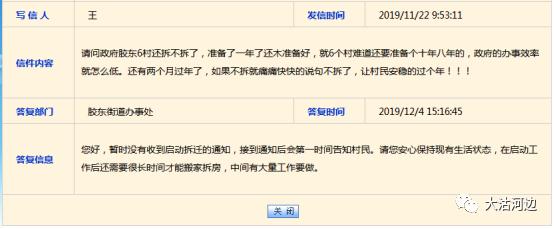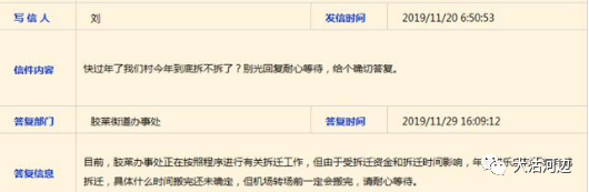胶州政务网截图12月4日,据胶东办事处答复:暂时没有收到启动拆迁的通知,接到通知后会第一时间告知村民。请您安心保持现有生活状态,在启动工作后还需要很长时间才能搬家拆房,中间有大量工作要做。据官方的口径,现在还没有要启动拆迁的通知,如果有了拆迁通知,还要等好长时间才能搬家拆房子,小编感觉今年胶东6村的拆迁可能性不大,如果说年前能启动的话,但未必能搬家?但是据日前政务外网的答复,足以证实了这一说法。