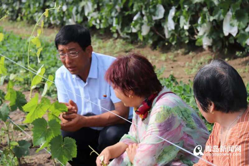 莱西市日庄镇沟东新村党支部书记高维玉(左一)与村民一起查看葡萄长势。