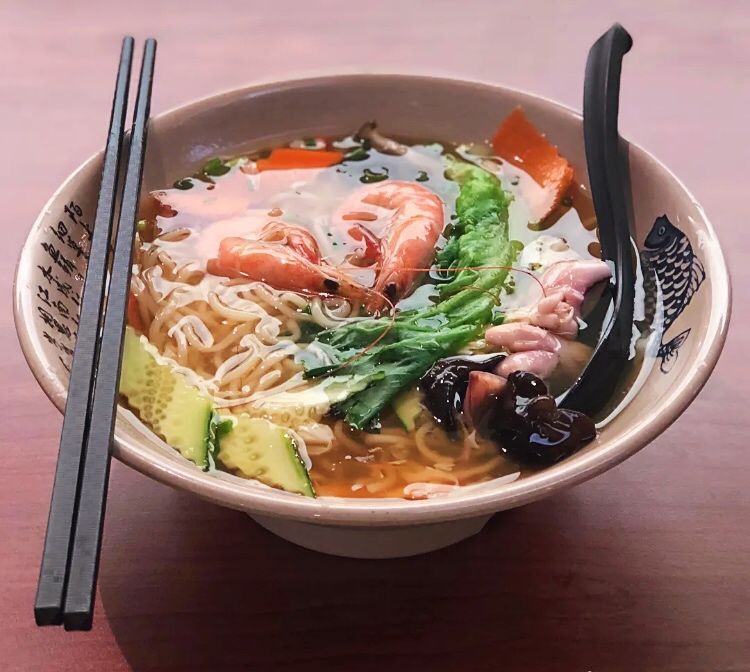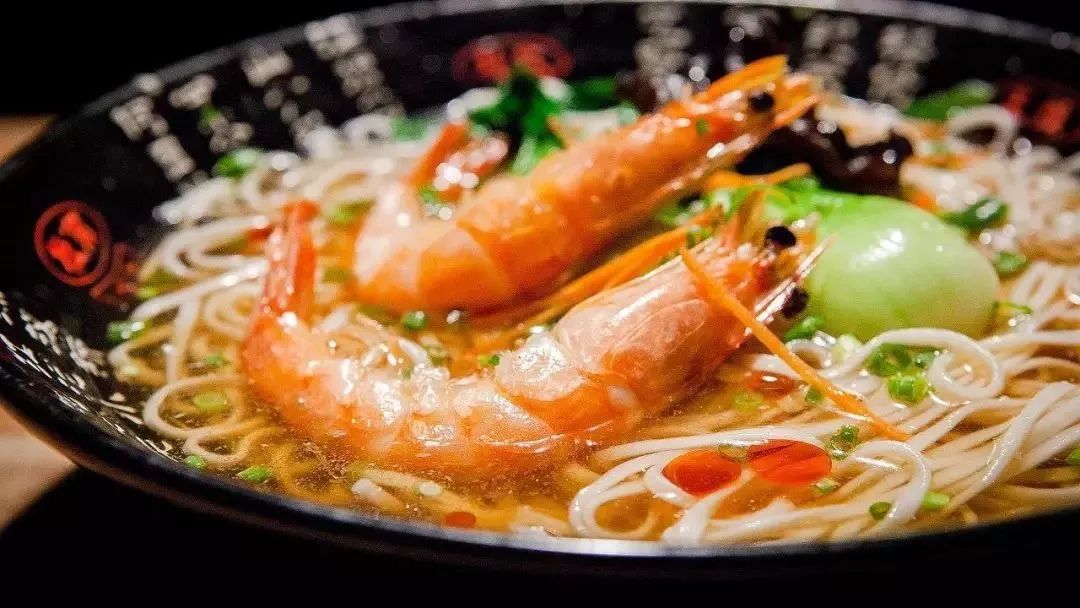 也有会放一整只大虾的,鲜红的大虾躺在看起来就很鲜滑美味的小面上,让人迫不及待地想要大快朵颐。一碗热腾腾,鲜香爽滑的蓬莱小面是蓬莱人每天清晨,早起排队的情怀。