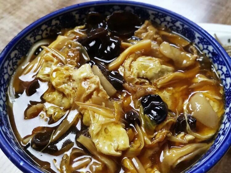 打卤面虽源自山西,却在山东大放光彩,从饭店酒家到家家户户的饭桌,山东人对打卤面的爱无可替代。其中,老济南打卤面最为出名。以鸡、鸭、肘子为底熬制的高汤,配肘子片、鸡蛋羹片、笋片、木耳、滑蛋,勾芡加花椒油,浇在刚出锅的面条上,淡茶色汤汁泛着油亮的光泽,一碗面下肚,真真正正的滋润舒坦!