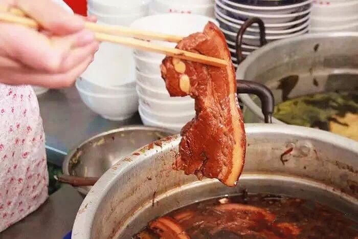 滕州人对大肉手擀面的热爱从清晨就开始了,咕嘟嘟的大锅里面条翻滚,一旁铁锅里珍藏的老卤中,酱着滋味十足的大块肥瘦五花肉、豆腐卷、卤蛋;结实有劲儿的老板擀着面条,随点随下,老板娘舀一勺酱汤,夹一块大肉,顷刻间,一碗热腾腾的大肉手擀面就被送到手上了。