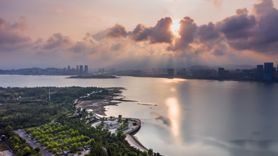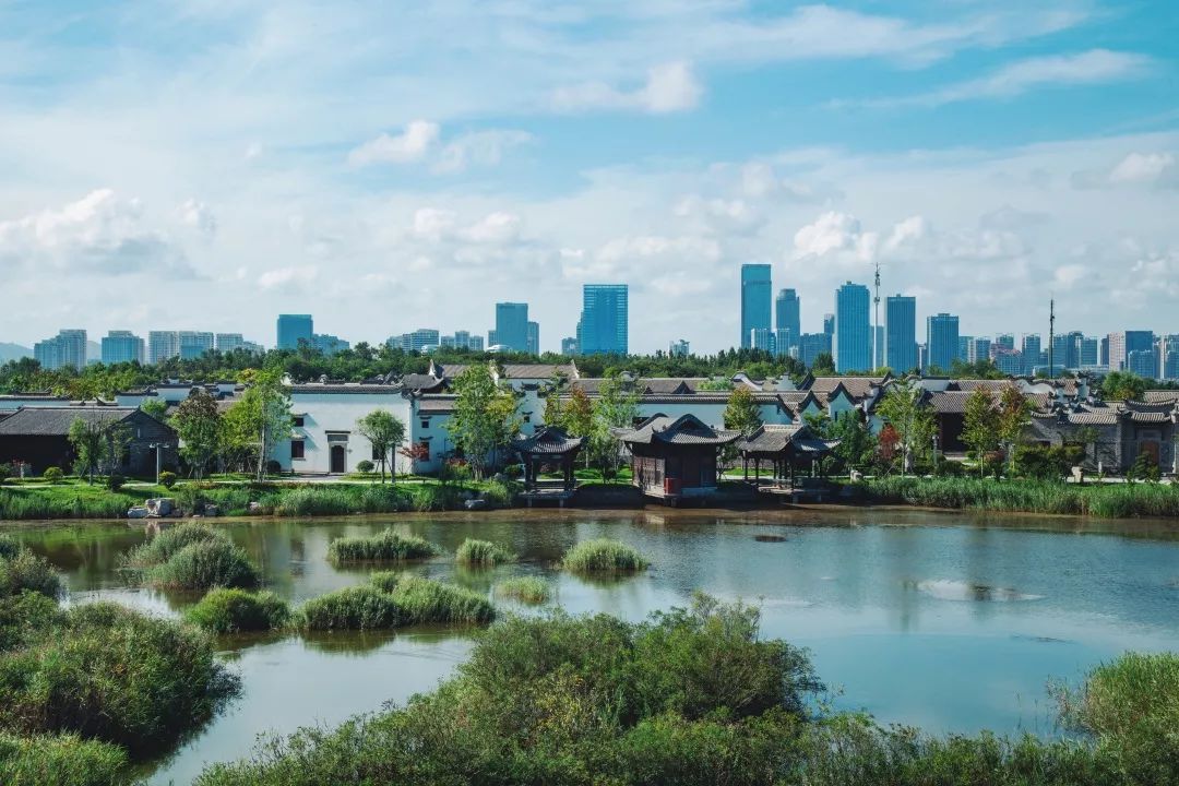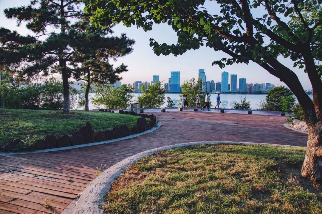南岸为湿地公园,全长3.9公里,占地30万平方米,湿地面积1637.6公顷,于2012年正式开放,自东向西依次为体现时尚活力的城市游乐区、侧重文化艺术的文化活动区、展现浪漫休闲的滩涂风情区和再现生态自然的湿地体验区。