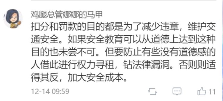 大部分网友持观望态度,认为扣分罚款就是为了减少违章,维护交通安全,如果安全教育能在道德上真有约束并非不可。但还是要防止那些没有道德感的人钻法律漏洞。↓
