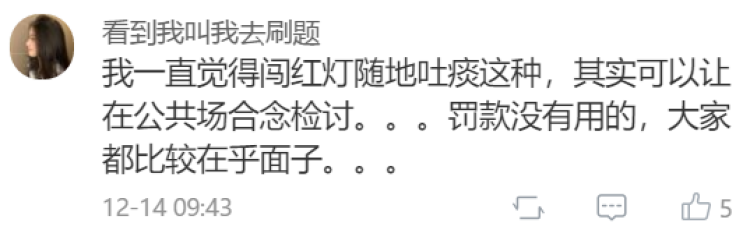 还有人直接给出了自己的建议,罚款教育都没有用,应该在公共场合念检讨,毕竟人都比较在乎面子......↓