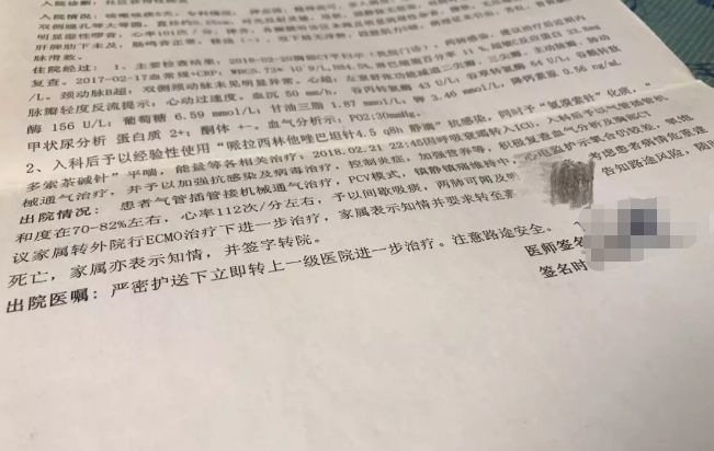 考虑患者病情危重,建议家属转外院行ECMO治疗,告知路途风险,随时死亡。