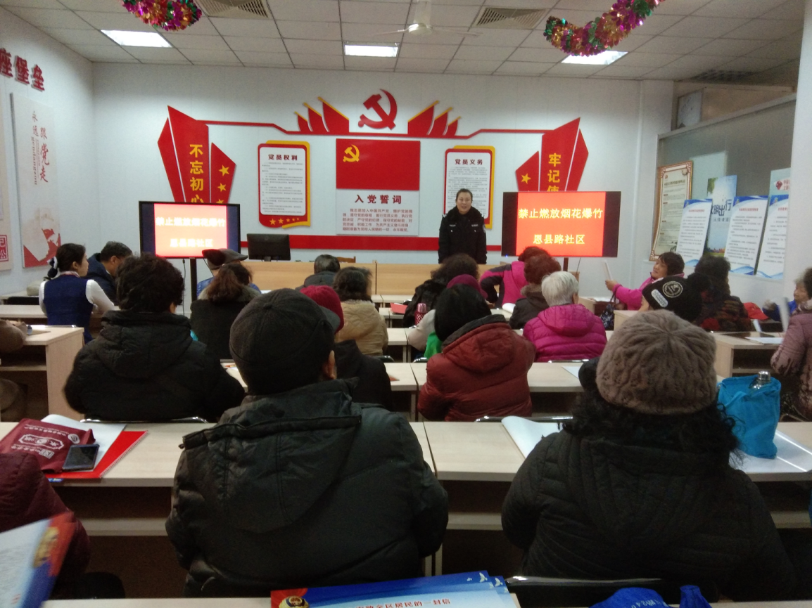 青岛新闻网12月20日讯 为了进一步加强禁止燃放烟花爆竹的宣传工作,消除火灾隐患、减少环境污染、维护社区稳定,近日,即墨路街道恩县路社区党委邀请辖区片警为社区居民开展了一堂主题为《禁止燃放烟花爆竹》的讲座。社区党支部书记、党员及社区居民共三十余人参加了此次活动。