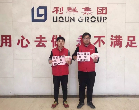 张耀和常东森两人的事迹经过多家媒体报道后,受到了社会广泛关注。为表彰张耀和常东森两人的先进事迹,发扬正能量,利群集团奖励张耀、常东森每人1万元奖金,他们在关键时刻,发扬了利群人无私奉献、助人为乐的精神,向他们致敬!