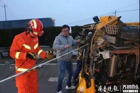 25岁张耀和26岁的常东森,在事发当时,正在执行从利群胶州物流中心向利群烟台地区门店送货的任务,行至青威高速海阳服务区附近时,发现前方发生了一起三车相撞事故,见此情景,两位小伙当机立断,立即上前救人。当时车祸现场有一辆货车侧翻,一辆面包车追尾一辆半挂,现场多人受伤,其中面包车司机休克,侧翻货车司机腿部骨折,被方向盘卡在了驾驶室内,十分痛苦。