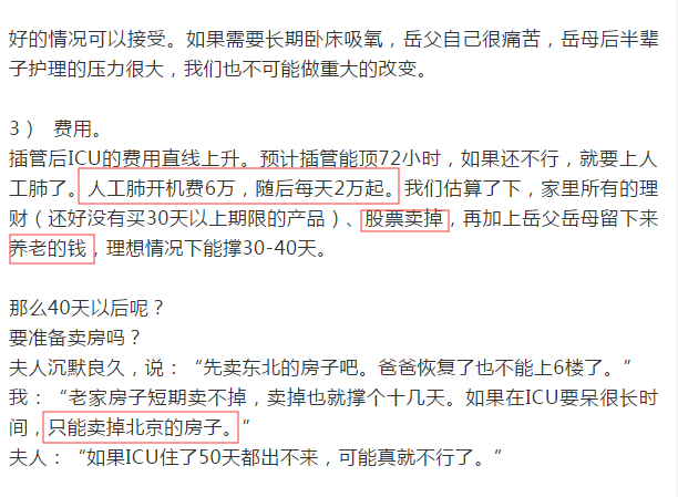 “人工肺开机费6万,随后每天2万起。我们估算了下,家里所有的理财(还好没有买30天以上期限的产品)、股票卖掉,再加上岳父岳母留下来养老的钱,理想情况下能撑30-40天。”
