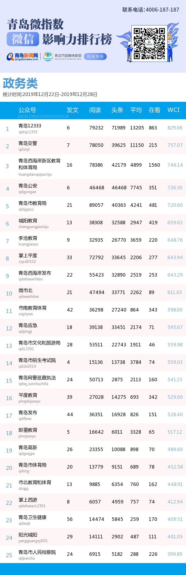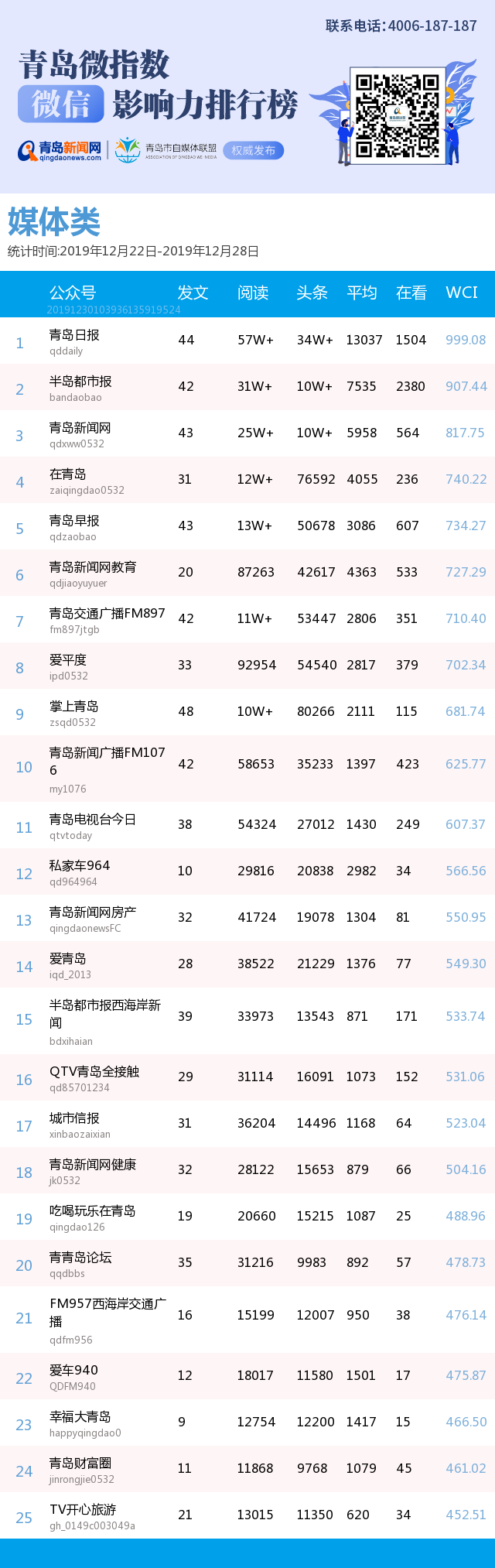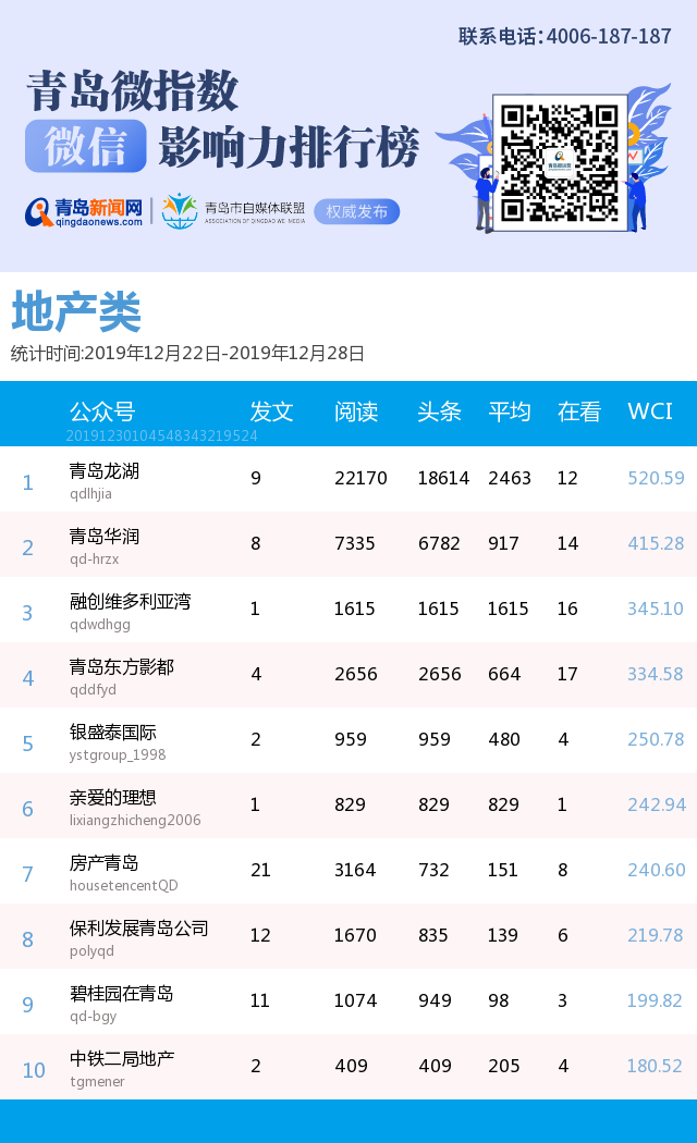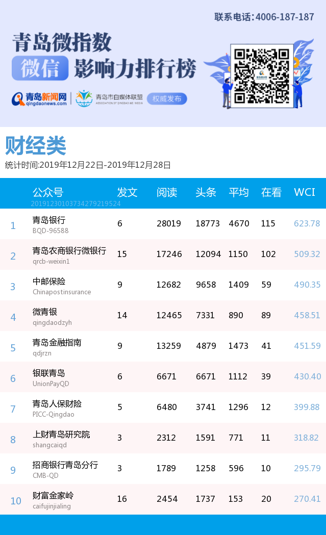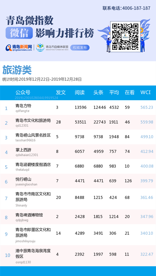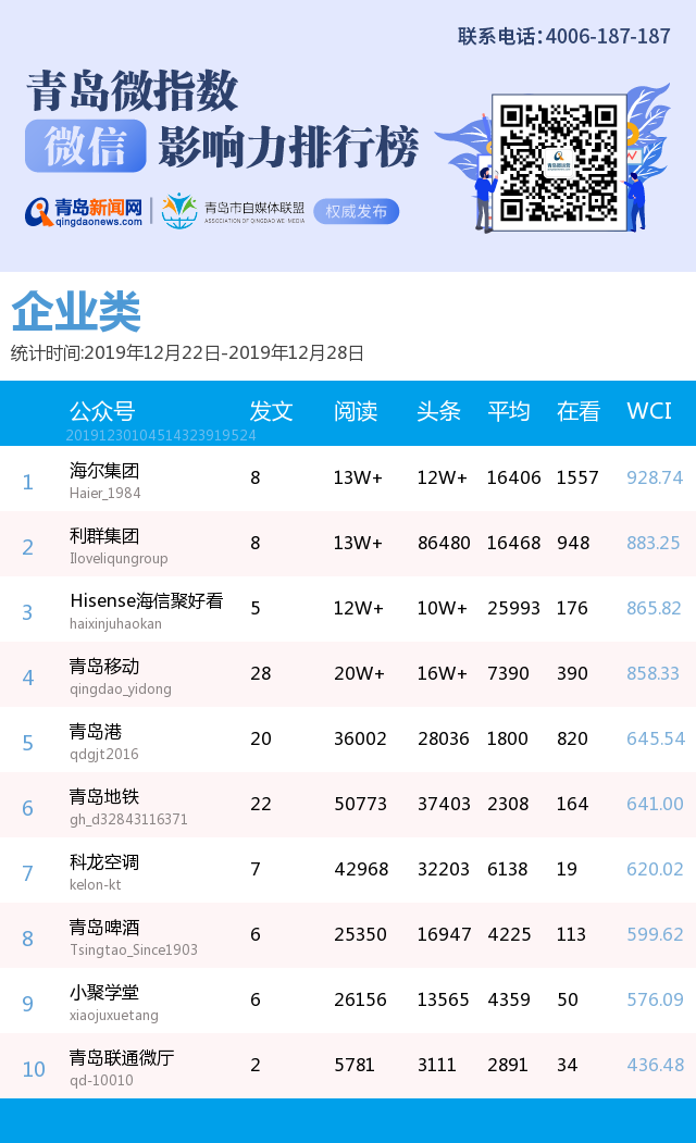 3、本次榜单收录了青岛14个行业微信公众号,如您的账号暂未收录,可联系4006-187-187。