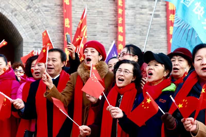 “我和我的祖国,一刻也不能分割,无论我走到哪里,都流出一首赞歌……”伴随着《我和我的祖国》这熟悉旋律的响起,即墨妇联“巾帼女神方队”领唱,现场的参赛者、游客、工作人员的目光被聚拢,热情被点燃,从五六岁的幼童到六七十岁的长者,大家挥舞着手中的小红旗,千人放声歌唱,迎接新年的到来,嘹亮的歌声回荡在即墨古城上空。