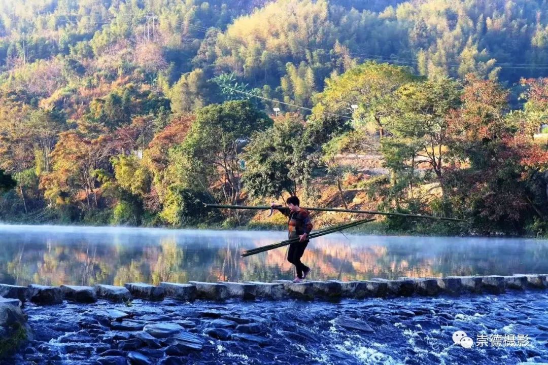 ▲ 12月3日早晨,福建省漳州市南靖县云水谣,一位农家妇女在跳岩上走过。