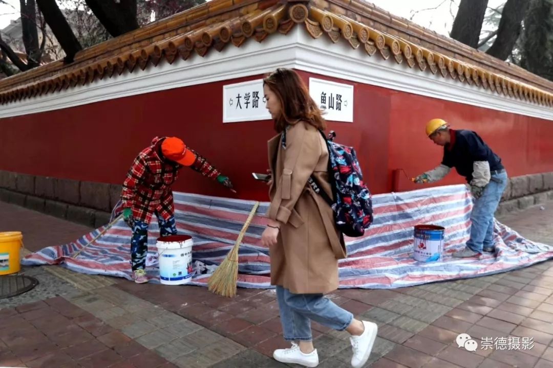 ▲ 4月19日,山东省青岛市大学路与鱼山路拐角处的“网红墙”前,两位工人正在用红色涂料修补被拍照者蹭掉的墙皮,迎接“五一”黄金周的到来。