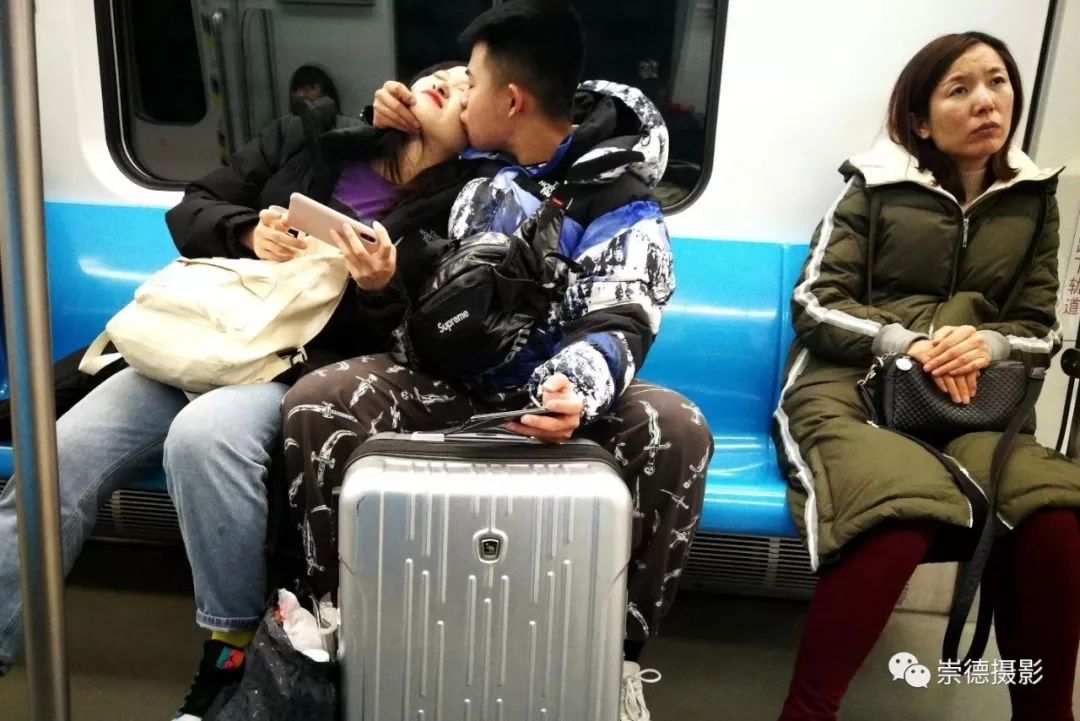 ▲ 1月3日,山东省青岛市地铁三号线上,一位小伙在亲吻女友。