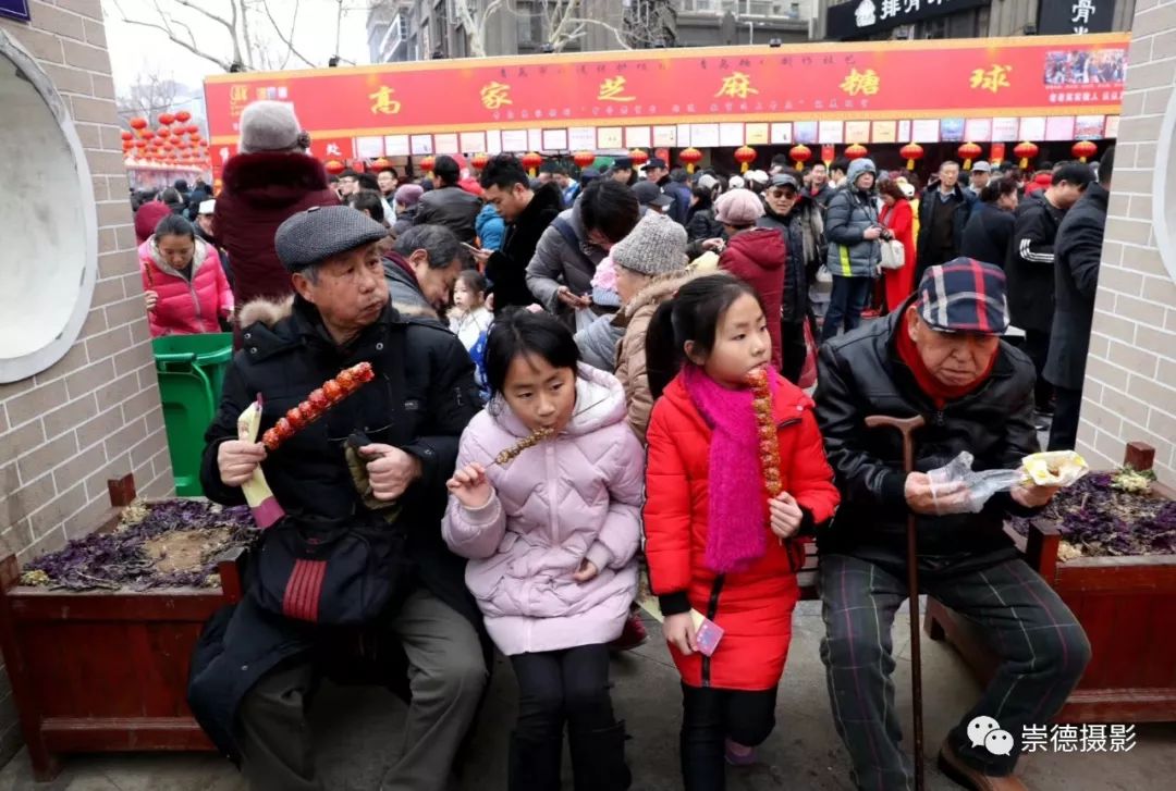 ▲ 2月18日,山东省青岛市海云庵糖球会,二位老人与两位女孩在品尝高家芝麻糖球。