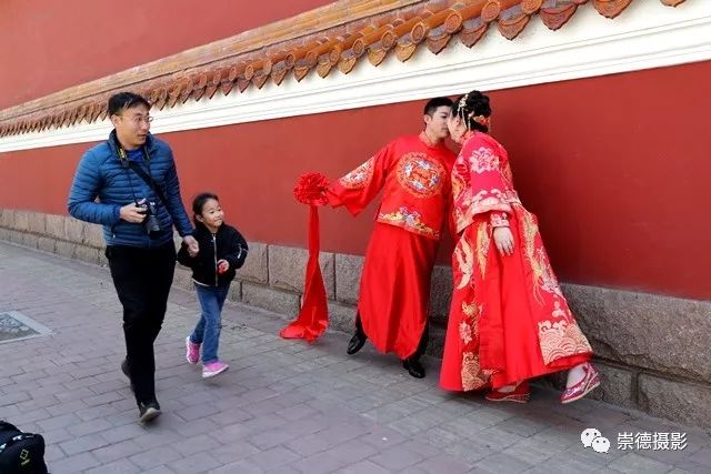 ▲ 9月5日上午,山东省靑岛市大学路,身穿红衣的一家三口在红墙外拍摄纪念照。