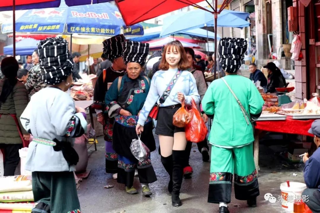 ▲ 10月28日上午,湖南省湘西州凤凰县禾库镇赶场日,一位当地的年轻女子行走在身穿苗族传统服装的老人中间。
